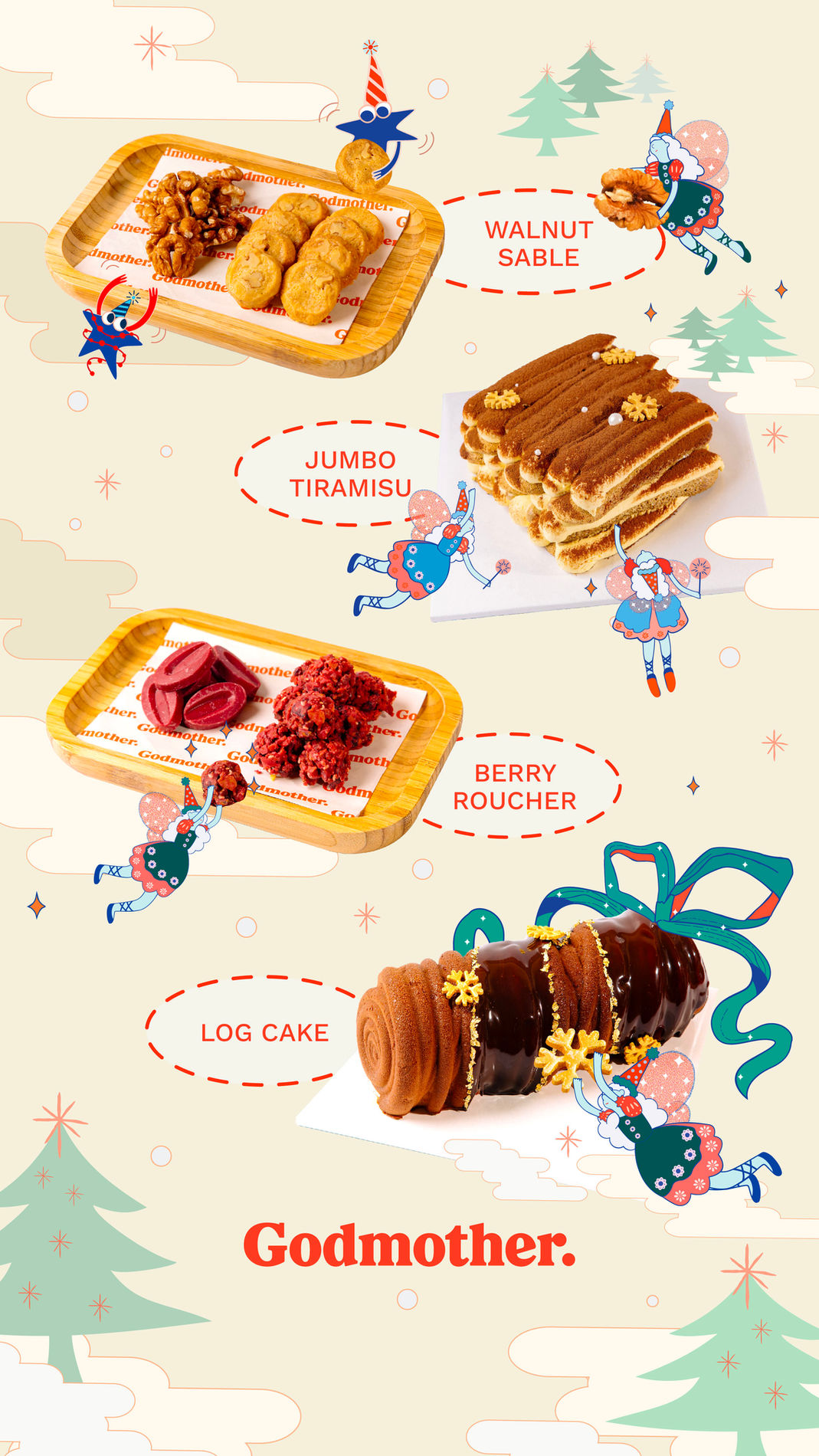 Godmother Bake & Brunch’s Christmas Campaign 2024 is inspired by the enchanting concept of a Fairy Godmother bringing exclusive seasonal delights to customers. The visual theme revolves around tiny fairies playfully interacting with the festive treats—placing ingredients on desserts, enhancing savory dishes, and bringing a touch of magic to every bite.